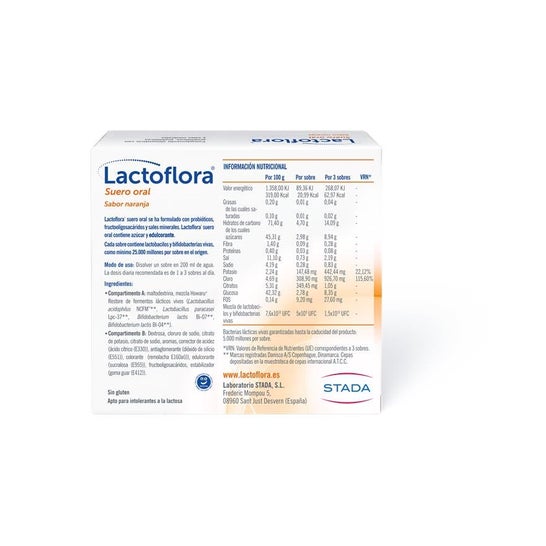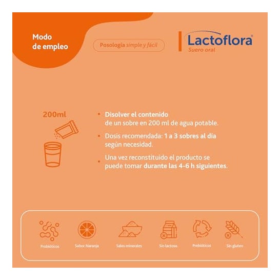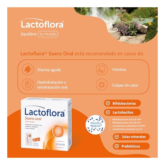 Lactoflora Suero Oral présente une formule qui combine des probiotiques, prébiotiques et sels minéraux, conçue pour reconstituer les liquides et électrolytes perdus dans des situations de déshydratation légère à modérée, comme cela se produit dans les cas de diarrhée, vomissements ou transpiration excessive. Pour cette raison, ce produit peut être utilisé comme sérum dans les cas de diarrhée, gastro-entérite ou vomissements. Il est disponible en saveurs d'orange et de fruits des bois.