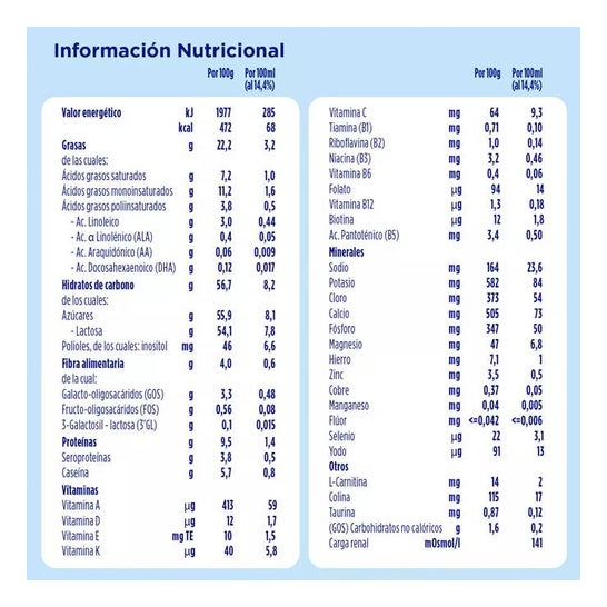 Lactose (de LAIT), huiles végétales (palme, coco, canola, tournesol, tournesol à haute teneur en acide oléique), LAIT écrémé, lactosérum déminéralisé (de LAIT), galacto-oligosaccharides (de LAIT), concentré de lactosérum (de LAIT), fructo-oligosaccharides, phosphate de calcium, huile de POISSON**, concentré de protéines (de LAIT), fructo-oligosaccharides, phosphate de calcium, huile de poisson.(du LAIT), concentré de lactosérum (du LAIT), fructo-oligosaccharides, fructo-oligosaccharides, phosphate de calcium, huile de POISSON**, protéines de lactosérum (du LAIT), phosphate de calcium, huile de poisson**, protéines de lactosérum (du LAIT).protéine de petit-lait (issue du LAIT), chlorure de potassium, citrate de potassium, hydrogénophosphate de magnésium, huile de Mortierella alpina, carbonate de calcium, chlorure de choline, citrate de sodium, L-acide, acide L-ascorbique, chlorure de choline.cido L-ascórbico, emulsificante (lecitina de SOJA), cloruro de sodio, taurina, inositol, cloruro de magnesio, sulfato de hierro, L-Triptófano, L-ascorbate de sodium, L-carnitine, sulfate de zinc, cytidine 5'-monophosphate, sel de sodium de l'uridine 5'-monophosphate, antioxydant (palmitate d'ascorbyle), adénosine 5'-monophosphate, sel de sodium de l'inosine 5'-monophosphate, sel de sodium de l'uridine 5'-monophosphate, chlorure de sodium (lécithine SOYA).dica de inosina 5'-monofosfato, nicotinamida, D-pantotenato de calcio, acetato de DL-α-tocoferol, sal sómonophosphate, sulfate de cuivre, DL-α-tocophérol, DL-α-tocophérol, palmitate de rétinyle, riboflavine, chlorhydrate de thiamine, chlorhydrate de pyridoxine, iodure de potassium, acide folique, sulfate de manganèse, phytoménadione, sélénite de sodium, cholécalciférol, D-biotine, cyanocobalamine.