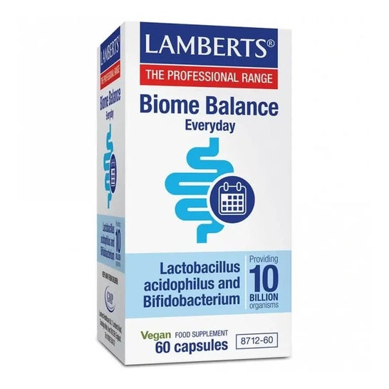 Lamberts Biome Balance Everyday 60 Capsules est un complément alimentaire probiotique formulé à base de lactobacilles et de bifidobactéries.