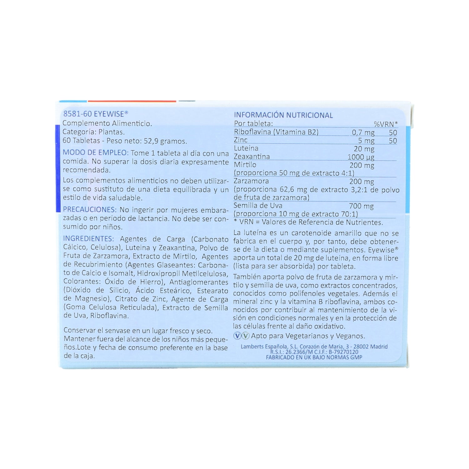 Lamberts Eyewise est un supplément de lutéine, de zinc et de vitamine B qui aide à maintenir une vision normale, à protéger les cellules des dommages oxydatifs et à prendre soin de l'état des vaisseaux sanguins des yeux.