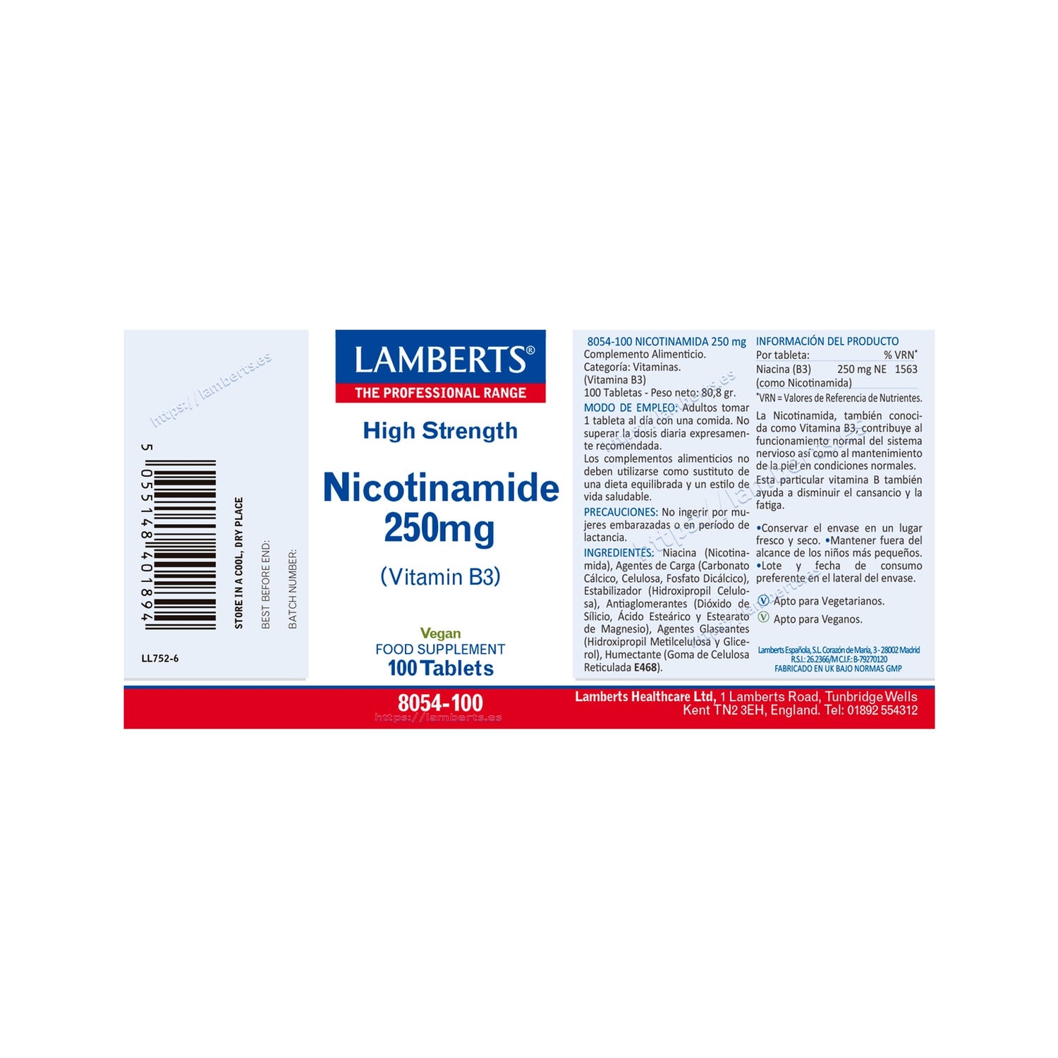 Lamberts Nicotinamide 250mg Vitamine B3 est un complément alimentaire qui fournit de la vitamine B pour le bon fonctionnement de l'organisme.
