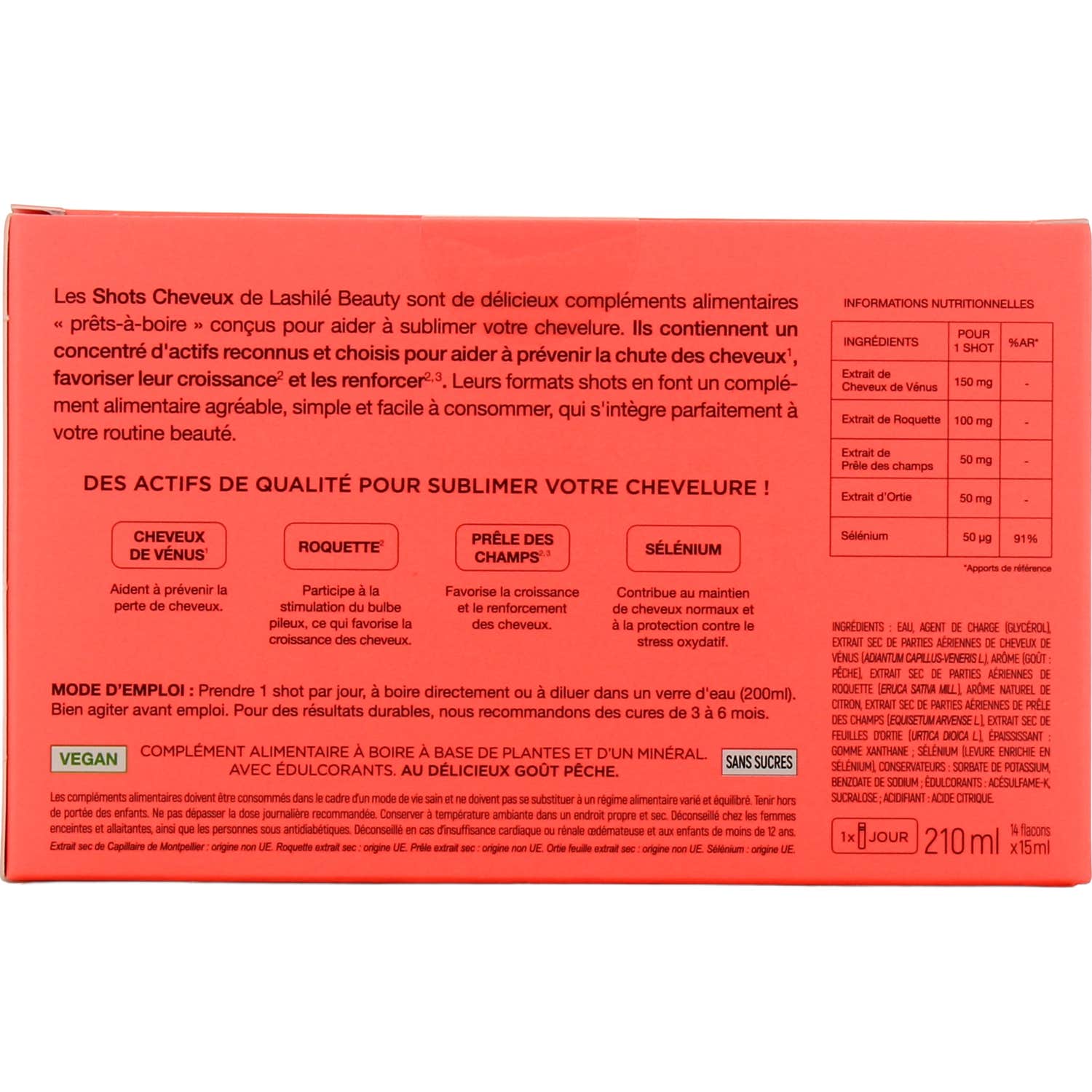 Lashilé Beauty Shots Cheveux est un complément alimentaire conçu pour prendre soin des cheveux de l'intérieur. Sa formule à triple action est pensée pour aider à :