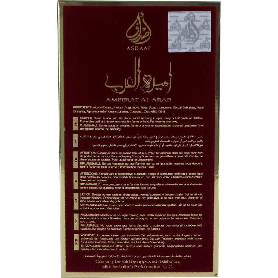 Lattafa Ameerat Al Arab Eau de Parfum 100ml est un parfum exceptionnel qui capture l'essence d'arômes exotiques dans une combinaison unique. Cette création de la marque Asdaaf se distingue par son originalité et son élégance, destinée aux femmes qui cherchent à mettre en avant leur individualité et leur attention aux détails. Idéal pour les occasions nocturnes ou les événements spéciaux, ce parfum laisse une impression mémorable.
