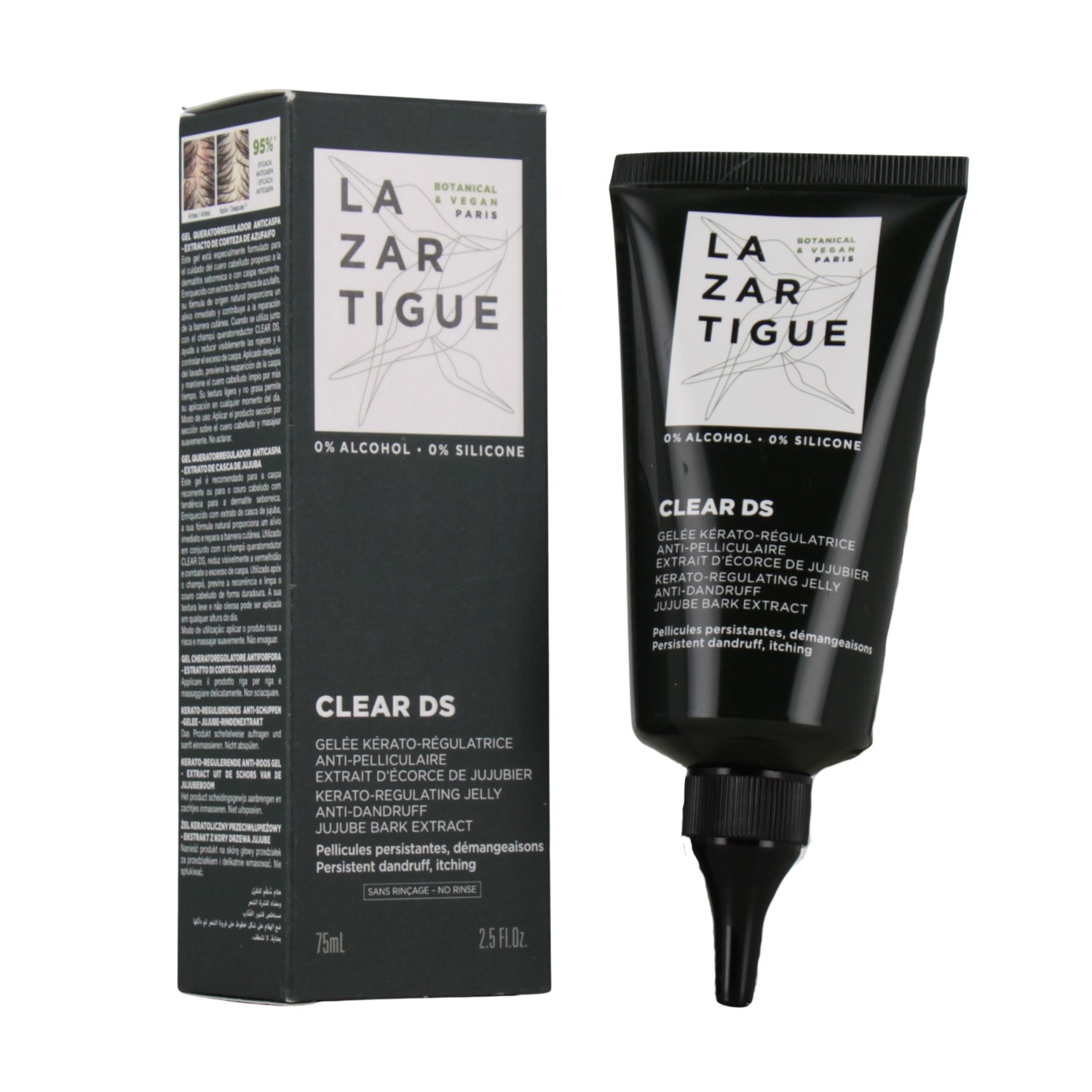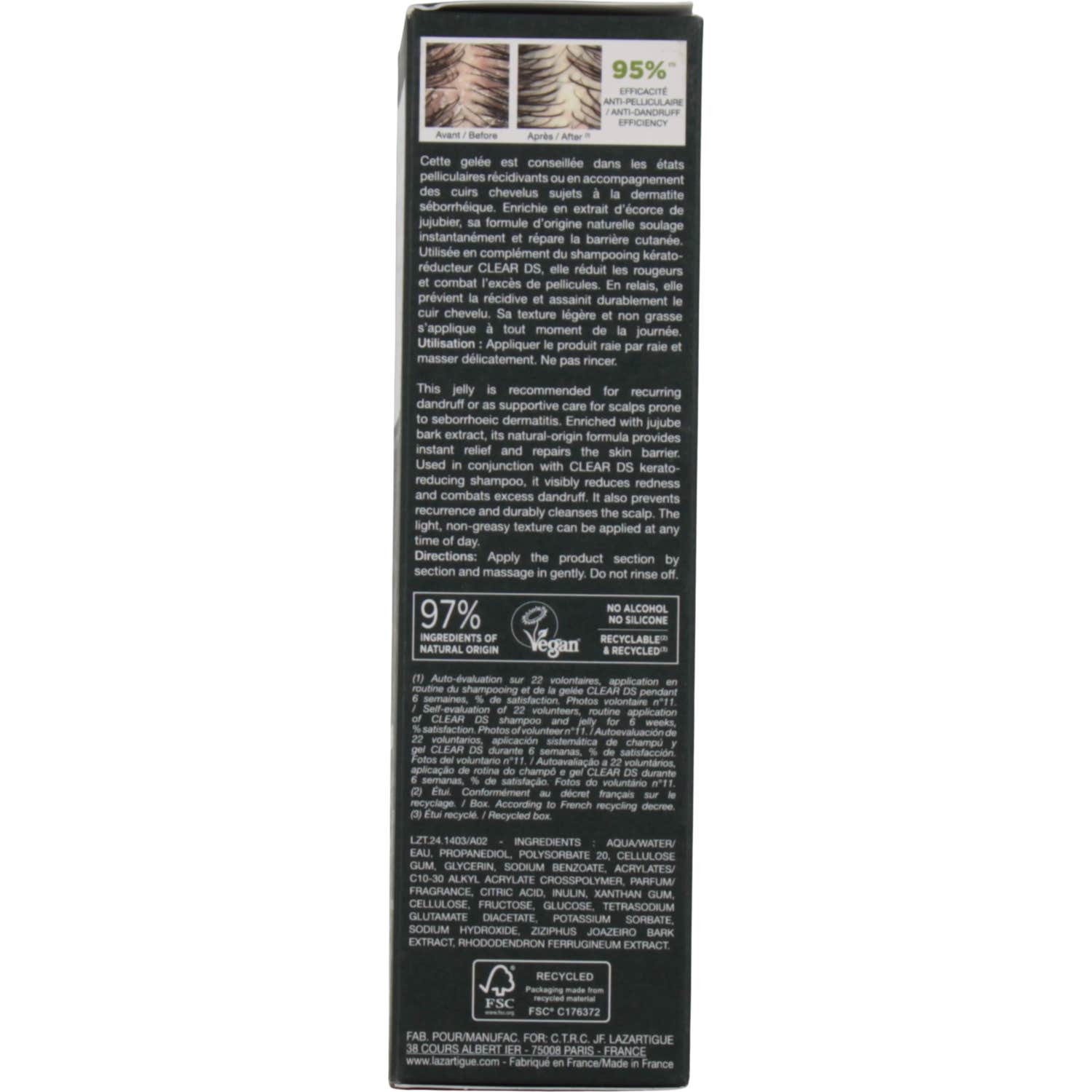 Lazartigue Clear DS s'applique sans rinçage, ce qui facilite son utilisation sur un cuir chevelu sec ou humide. Il ne laisse pas de résidus gras et permet aux cheveux de conserver leur flexibilité et d'être faciles à coiffer. Ce produit est sans alcool ni silicone, et convient aux végans.