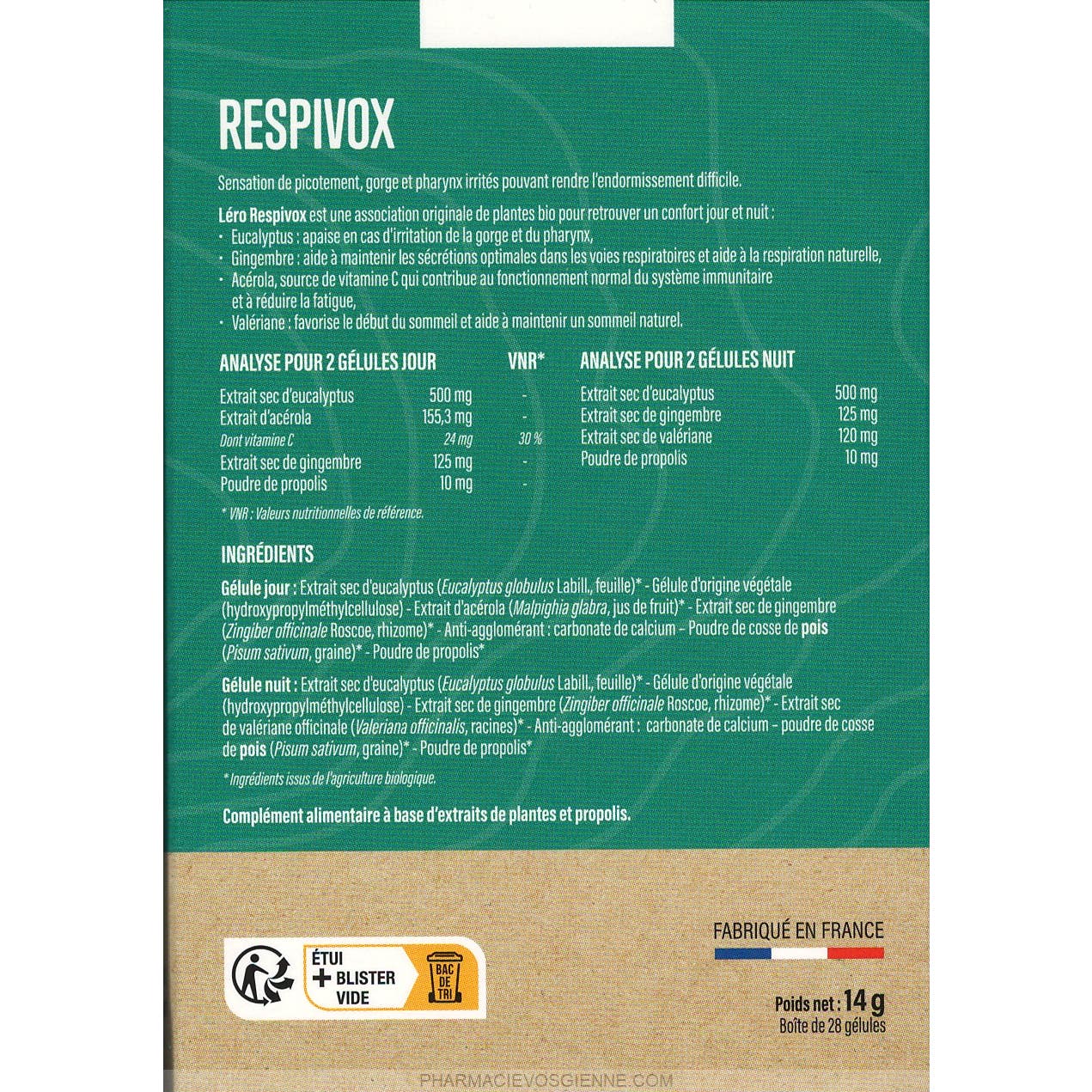 Lero Respivox 28 Perles est un complément alimentaire conçu pour apporter bien-être tout au long de la journée et de la nuit. Sa formule unique combine des extraits de plantes bio, chacun ayant des propriétés spécifiques qui aident à soulager l'inconfort dans la gorge et le pharynx.