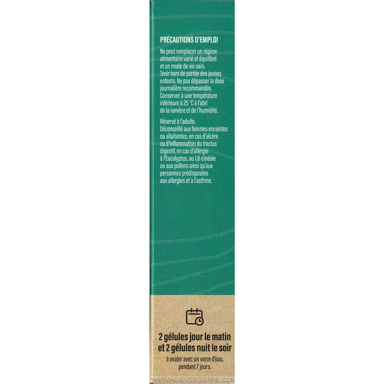 - Capsules de jour : 500 milligrammes d'extrait sec d'eucalyptus, 155,3 milligrammes d'extrait d'acerola (qui apporte 24 milligrammes de vitamine C), 125 milligrammes d'extrait sec de gingembre et 10 milligrammes de poudre de propolis.