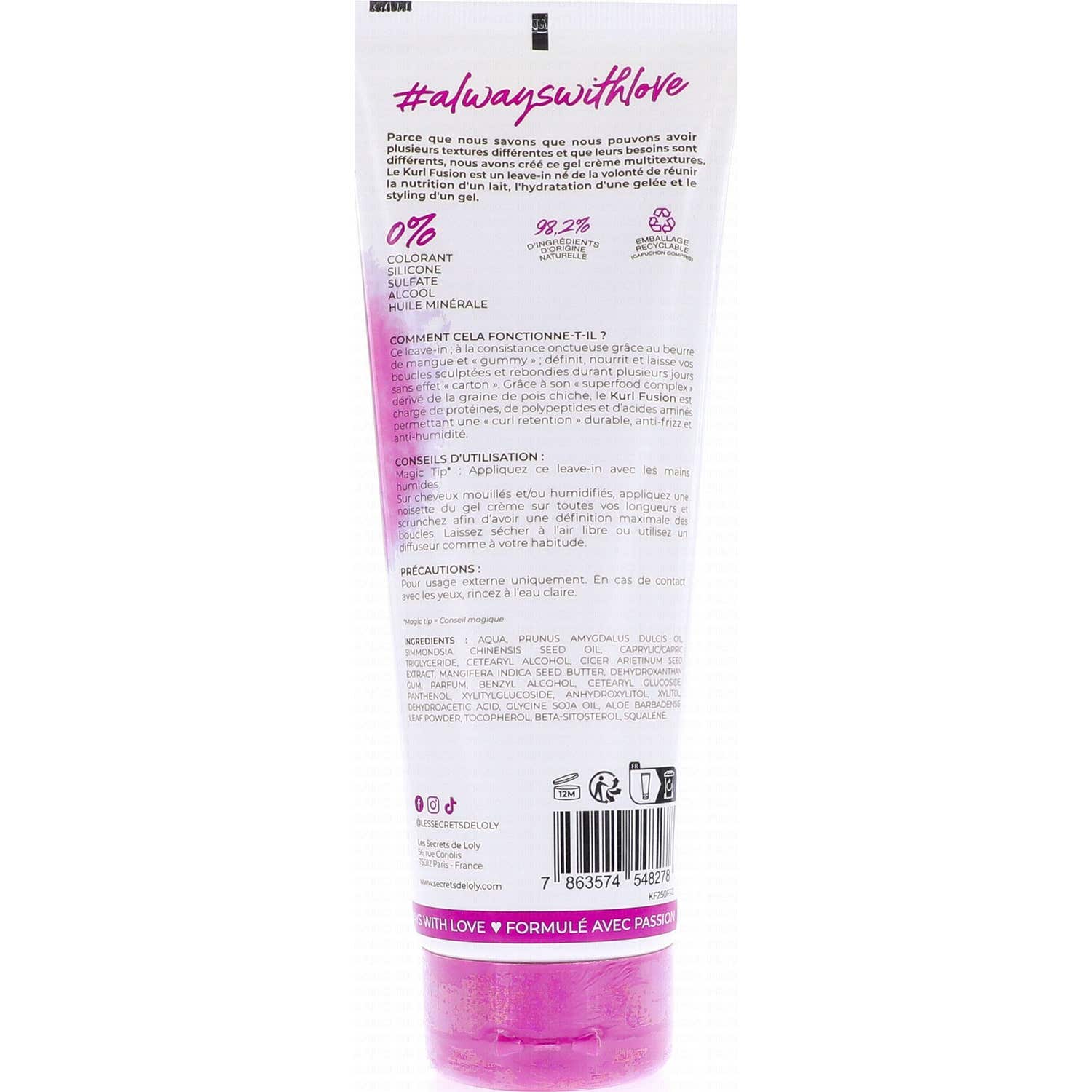 Les Secrets de Loly Kurl Fusion est un gel crème multitexture conçu pour répondre aux divers besoins des cheveux. Ce produit, qui ne nécessite pas de rinçage, combine les propriétés nutritives d'un lait avec l'hydratation et le style d'un gel, idéal pour les cheveux de différentes textures.