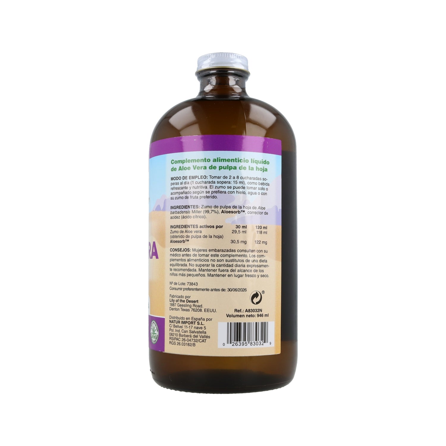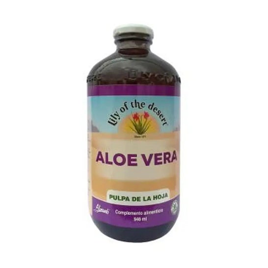 Lily Of The Desert Aloe Vera Pulp Leaf Glass 946ml est un complément alimentaire à base de pulpe d'aloe vera qui contient des polysaccharides et des acides organiques, tels que l'acide malique.