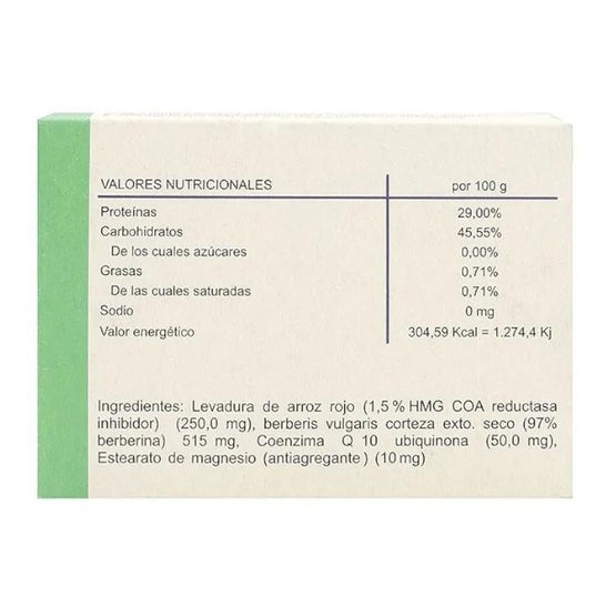 Extrait sec de Berberis (Berberis vulgaris L. racine), Agent d'enrobage (hydroxypropyl méthylcellulose et colorant - complexe de cuivre et de chlorophylline), Levure de riz rouge (Monascus purpureus Went) 4% Monacolines, Coenzyme Q10 (Ubiquinone) et Anti-agglomérant (sels de magnésium d'acides gras).