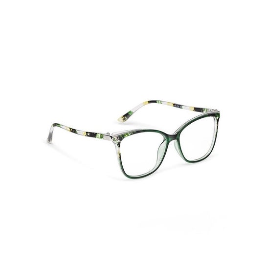 Lunettes en polycarbonate, avec des verres rectangulaires en polycarbonate et une certaine élévation en haut de la monture. La face avant est verte avec une finition caramel, associée à des branches à motifs asymétriques en vert, jaune et noir. Lunettes de presbytie. Lunettes pour la vision de près. Marque Loring. Verres en polycarbonate, disponibles en différentes prescriptions.