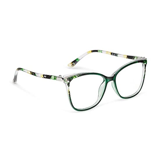 Lunettes pour femmes idéales pour les personnes atteintes de presbytie, avec des verres en polycarbonate de forme rectangulaire et légèrement surélevés dans la partie supérieure. Sa monture présente un imprimé asymétrique vert avec des finitions caramel, les branches sont vertes, jaunes et noires. Ces lunettes offrent un style féminin et contemporain, tout en aidant à la concentration sur les objets proches.