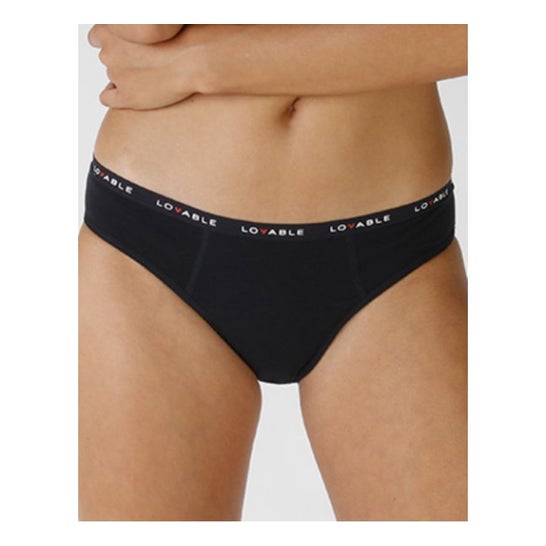 Sous-vêtements absorbants et réutilisables, composés de 93% de coton et adaptés aux jours de menstruation. Avec ces sous-vêtements, il n'est pas nécessaire d'utiliser des serviettes ou des tampons pendant le cycle menstruel, ce qui favorise une grande économie. Grâce à sa puissante absorption, la peau reste sèche et les odeurs sont neutralisées. Convient à tous les types de peau. Couleur : Noir. Taille L. Absorption abondante.