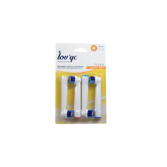 Lovyc Soft Flexo Electric Toothbrush Replacement 4 pcs. Brosse à dents électrique de remplacement pour le nettoyage buccal avec une dureté douce. la disposition de ses filaments améliore le nettoyage dentaire, en augmentant sa précision grâce à ses deux tailles de poils. adaptée au nettoyage des gencives sans les endommager, grâce au mouvement de rotation dans le même sens que la tête de la brosse. compatible avec les grandes marques.