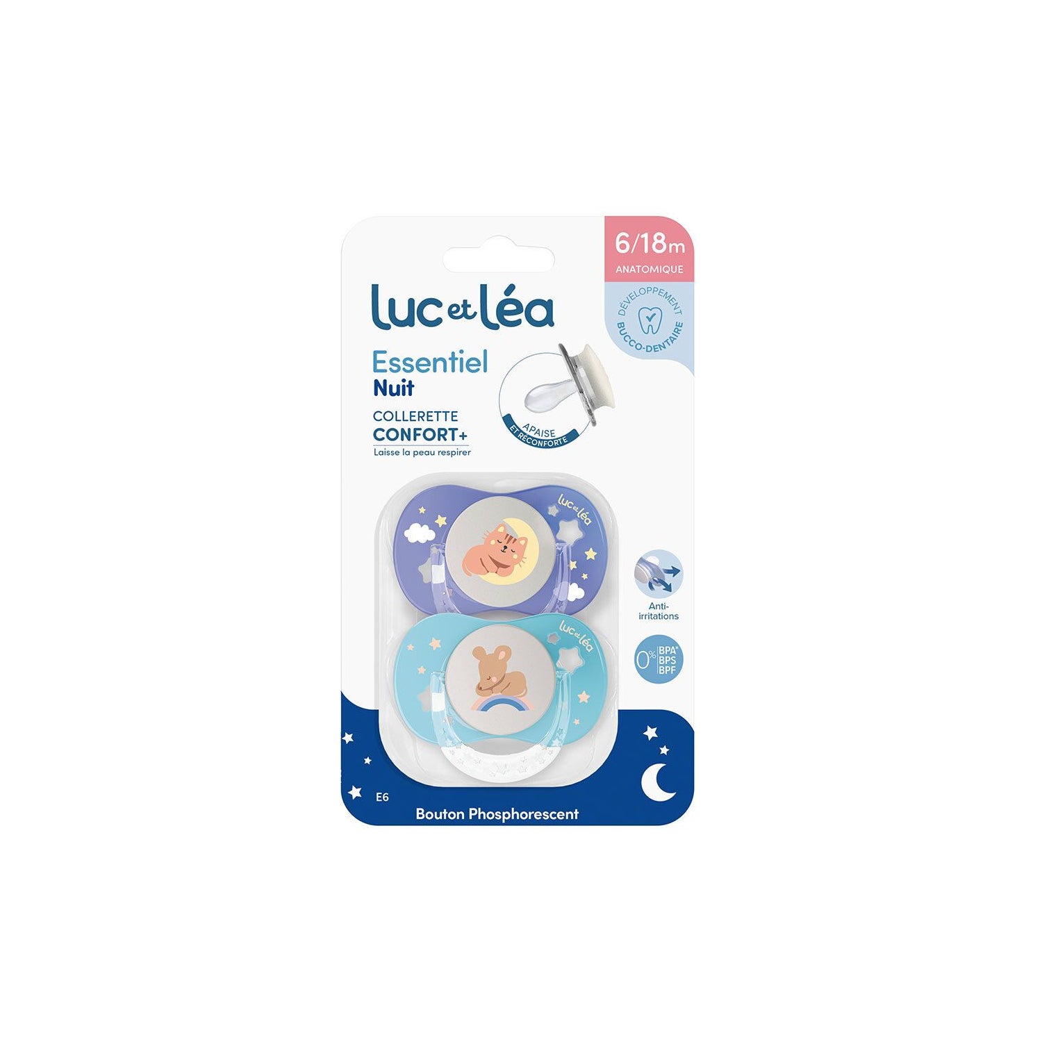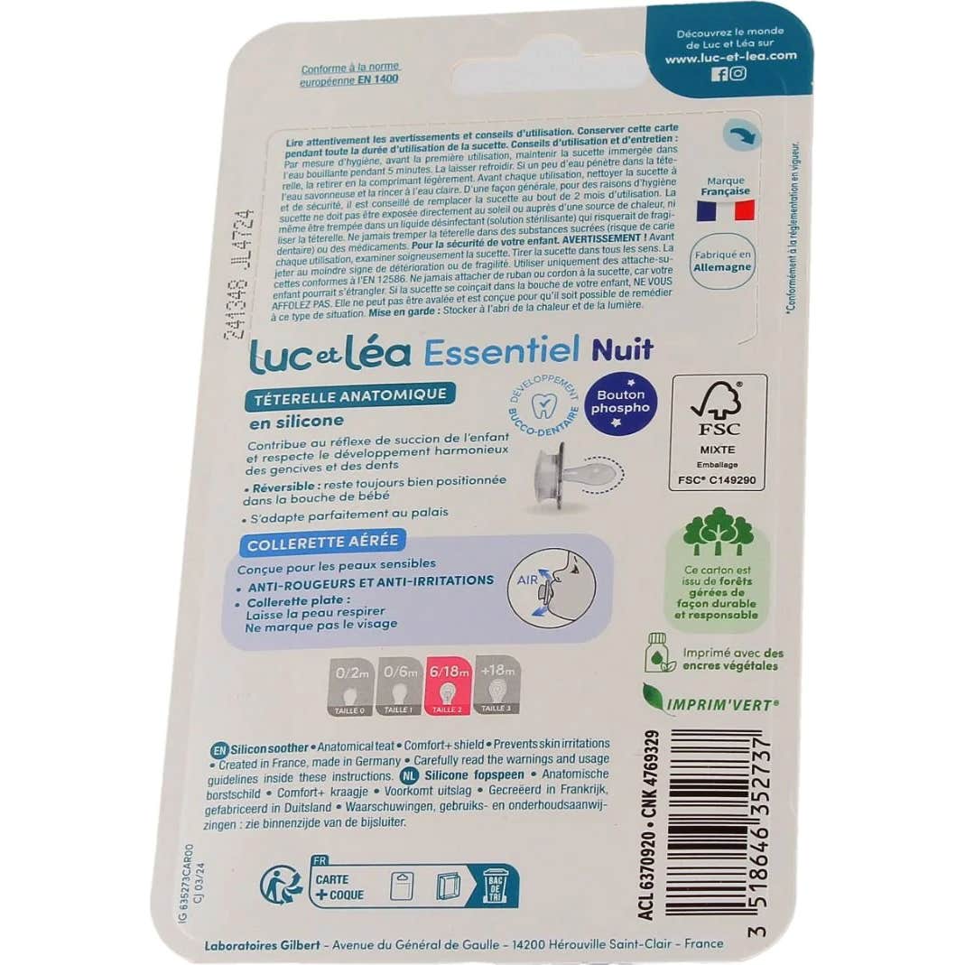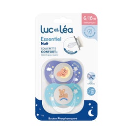 Luc Et Léa Essentiel Night Confort+ Sucette 6-18M E6 2 pcs est une sucette conçue pour les bébés de 6 à 18 mois, qui se distingue par sa capacité à briller dans l'obscurité. Cette sucette dispose d'un bouton phosphorescent qui fournit une douce luminosité, ce qui aide à apaiser le bébé pendant la nuit. De plus, ce design facilite aux parents de localiser la sucette dans la chambre sans avoir besoin d'allumer la lumière, évitant ainsi les interruptions du sommeil du petit.