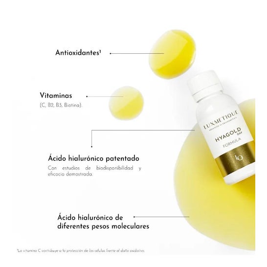 Complément alimentaire dans un format pratique à boire, développé pour aider à maintenir la santé de la peau. Fabriqué à partir d'un complexe d'acide hyaluronique de haute pureté appelé Hyabest®, en combinaison avec du jus de grenade, des vitamines C, B3, B9 et B2, qui favorisent la croissance et la force des cheveux. Favorise la protection des cellules contre les dommages oxydatifs, tout en éclaircissant le teint. Sans gluten, sans sucre, sans noix et sans lactose.