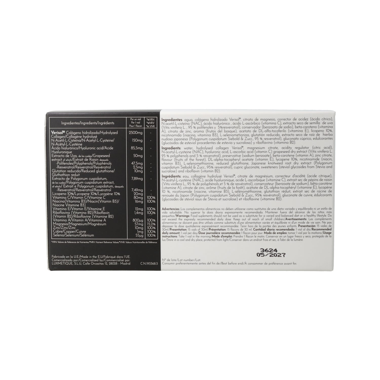Sa formule à base de collagène, d'acide hyaluronique, d'antioxydants, de resvératrol, de vitamines et de minéraux aide à restaurer l'élasticité de la peau du visage ainsi qu'à prévenir l'apparition des rides. La peau est plus ferme et plus lumineuse.
