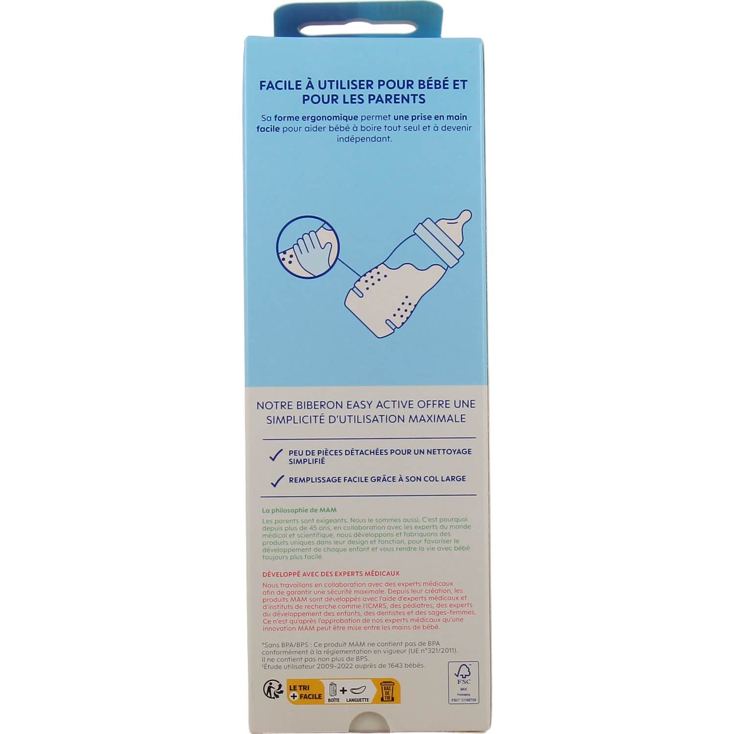 Mam Easy Active est donc une option idéale pour les familles qui recherchent un biberon fiable, hygiénique et confortable, adapté à l'évolution du bébé.