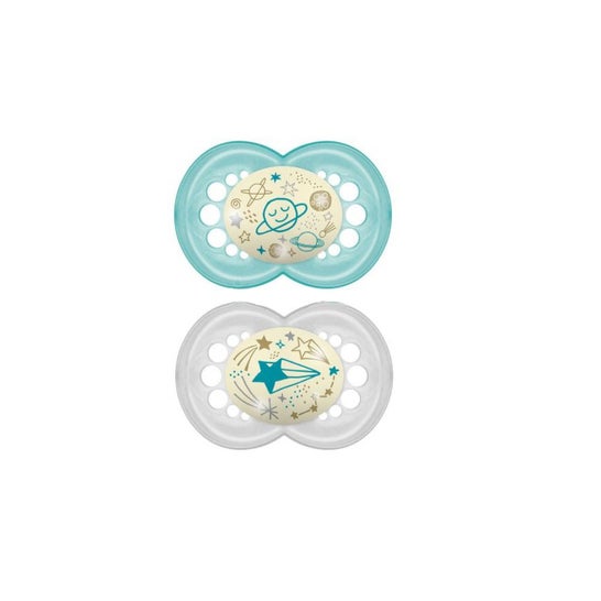 Mam Night Sucette en latex Fisio +6 m Bleu 2 pièces est un pack de 2 sucettes en latex mam Original Night pour les bébés de plus de 6 mois. La tétine anatomique en latex naturel s'adapte parfaitement à la bouche du bébé, lui procurant un confort de succion et favorisant le développement des muscles de la langue et de la bouche. Le bouclier de la sucette s'illumine dans l'obscurité pour faciliter son repérage à tout moment.