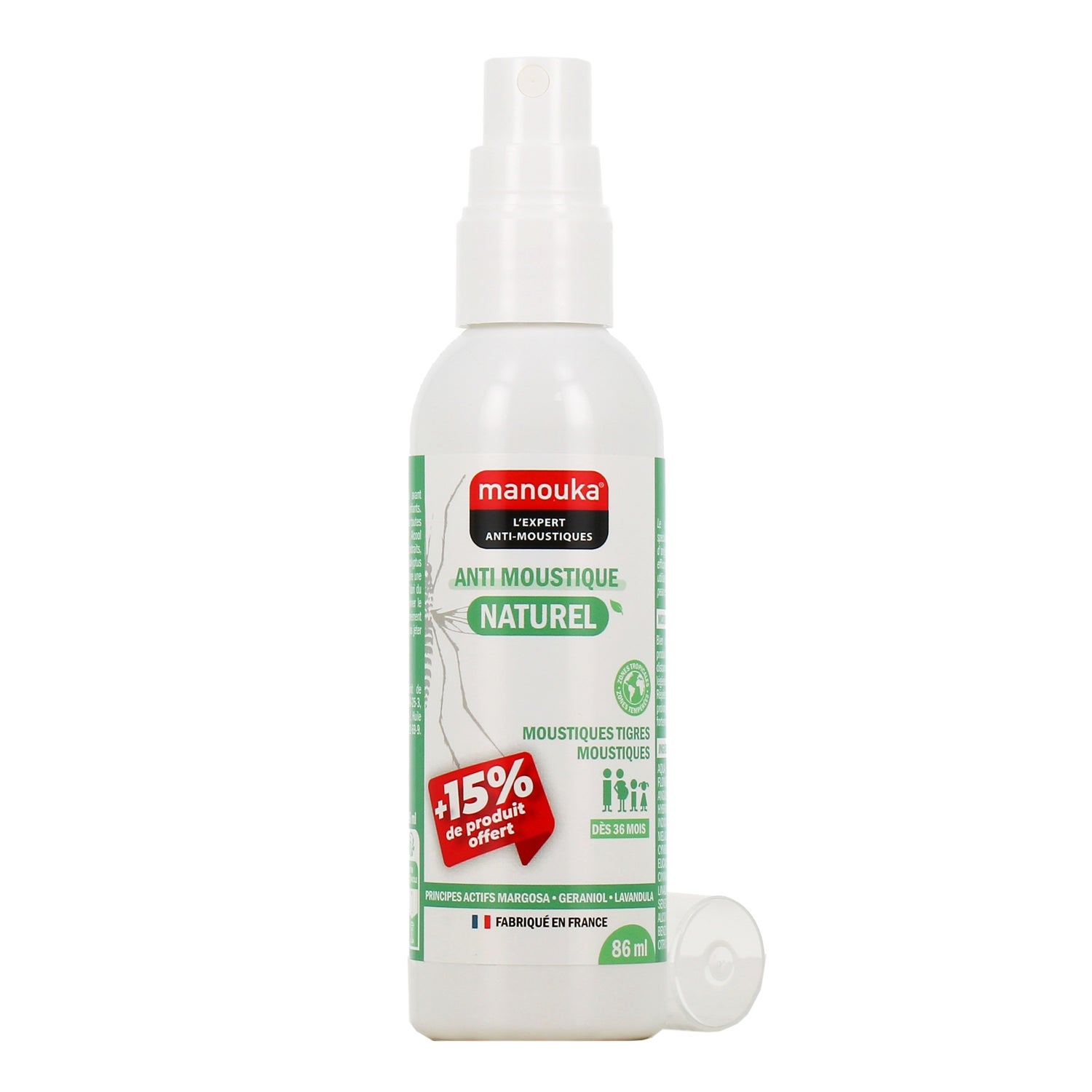 Manouka Anti-Mosquitos Spray Naturel de 86 ml est une solution efficace pour repousser les moustiques, élaborée avec des ingrédients d'origine naturelle et végétale, adaptée à toute la famille. Ce produit, fabriqué en France, est efficace contre :