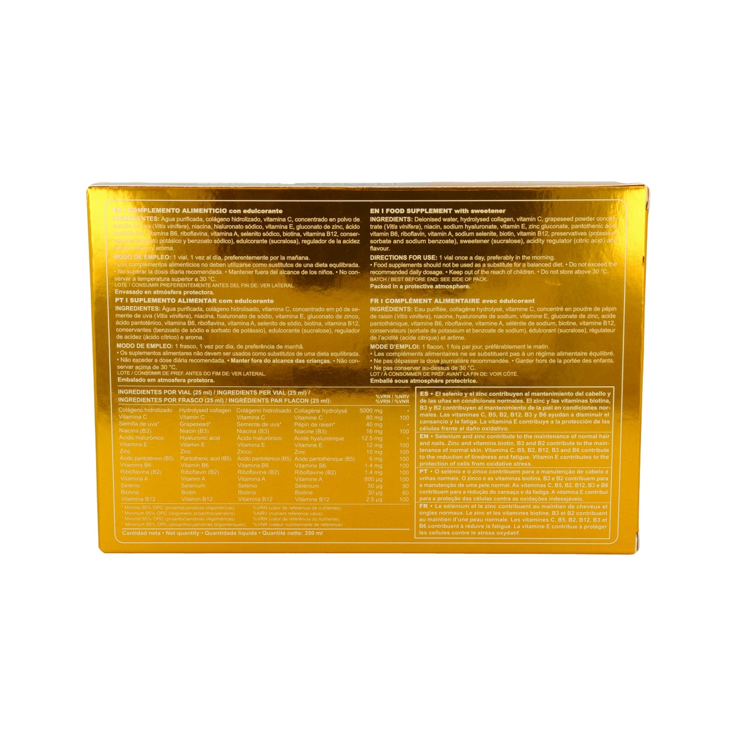 À base de collagène hydrolysé de type I, d'acide hyaluronique, de pépins de raisin (OPC) et de vitamines, la synergie des composants permet de rétablir la texture de la peau et de maintenir un aspect jeune.