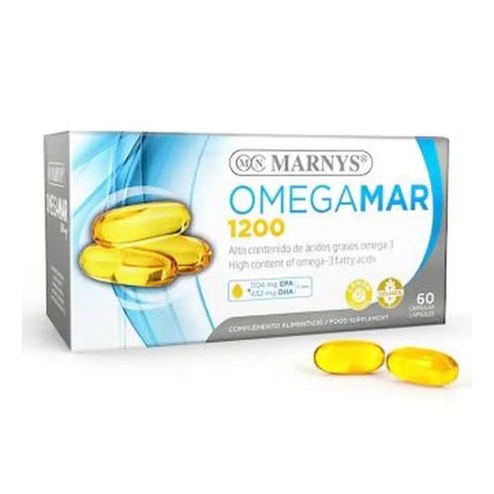 Marnys Omegamar 1200 60caps est un complément alimentaire sous forme de gélules à forte concentration en Oméga 3 EPA et DHA issus d'huile de poisson. Il contribue au fonctionnement normal du système cardiovasculaire et au métabolisme normal des lipides. Il facilite également le maintien correct de la vision et du système nerveux. Contient 60 gélules.