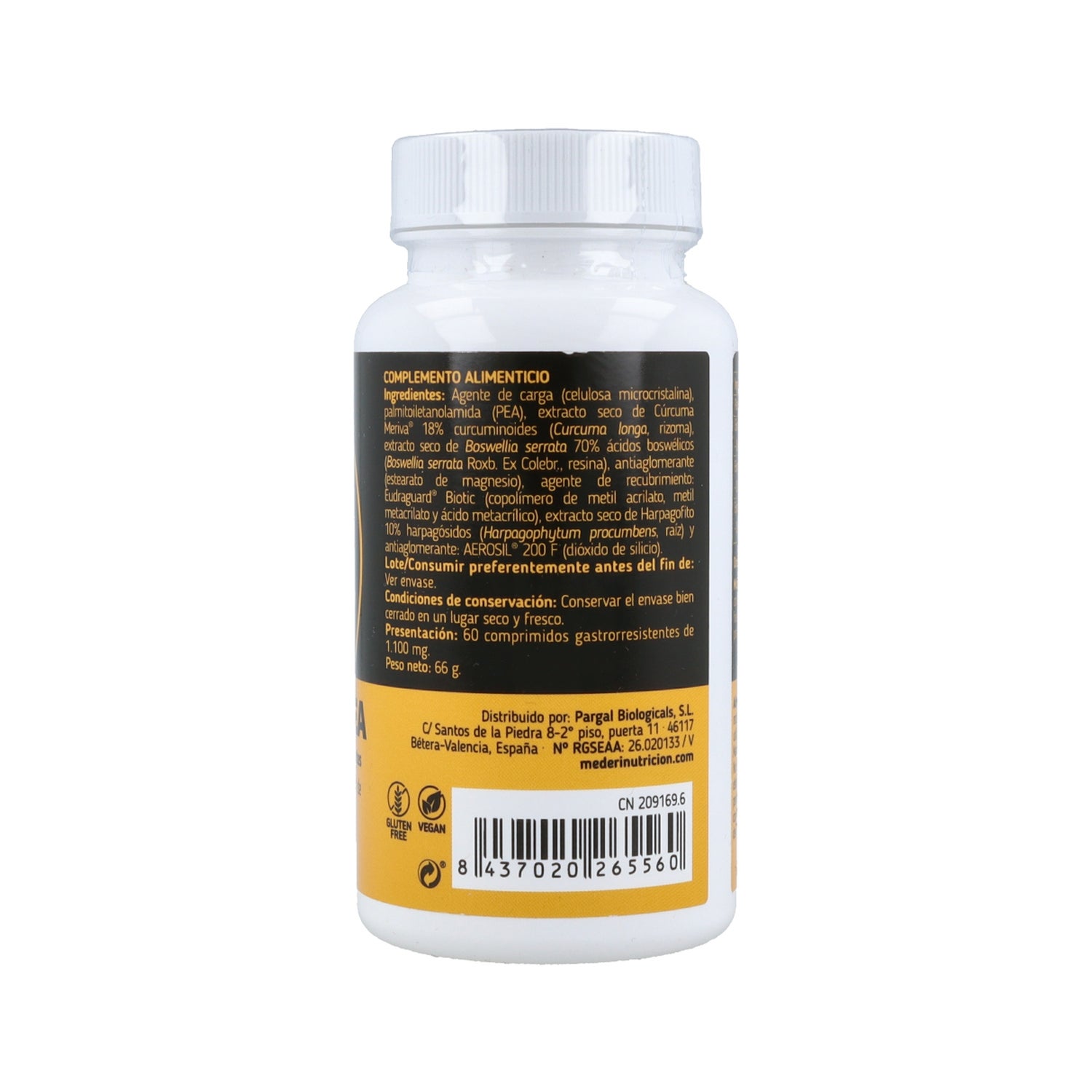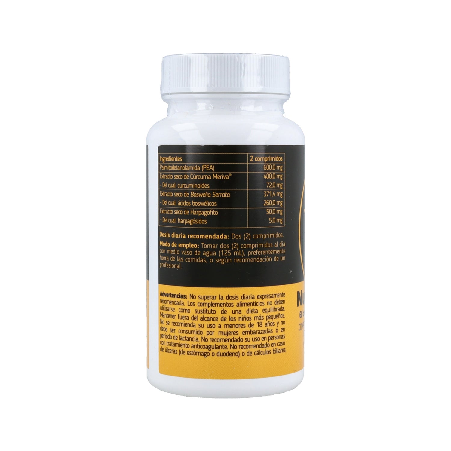 Palmitoyléthanolamide, Agent de charge (cellulose microcristalline), Curcuma Meriva™ extrait sec 18% curcuminoïdes (Curcuma longa, rhizome), Boswellia serrata extrait sec 65% acide boswellique (Boswellia serrata Roxb. Ex Colebr..., résine), Extrait sec d'Harpagofito 2,5% Harpagosides (Harpagophytum procumbens, racine), Antiagglomérant (stéarate de magnésium), Agent d'enrobage : Eudraguard® Biotic (copolymère d'acrylate de méthyle, de méthacrylate de méthyle et d'acide méthacrylique) et Antiagglomérant (dioxyde de silicium).