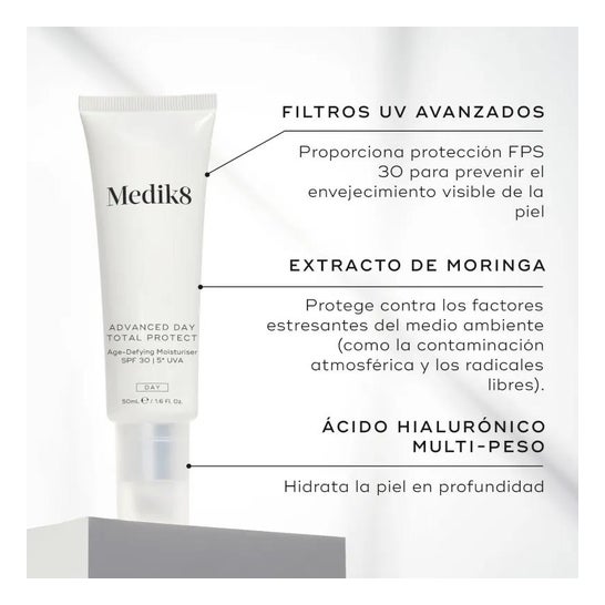 Medik8 Advanced Day Total Protect SPF30 50ml est une crème qui aidera ta peau à prévenir le vieillissement prématuré.