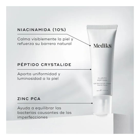 Sérum multiefecto avec des propriétés éclaircissantes et apaisantes. Formulé à base de niacinamide, zinc, acide hyaluronique et peptides de cristal. Aide à neutraliser l'hyperpigmentation du visage et les éruptions acnéiques, favorisant un visage hydraté et d'un ton uniforme. Ses composants ont des propriétés antioxydantes qui retardent l'apparition des signes de vieillissement. Sans alcool, parabènes ni parfum. Produit non testé sur les animaux. Recommandé pour les peaux sensibles ou rougies.