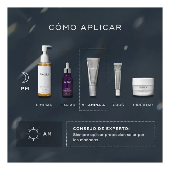 Utilisez deux fois par semaine pendant les deux premières semaines, une nuit sur deux pendant les deux suivantes, puis toutes les nuits. Consultez un médecin si tu allaite ou es enceinte. Tu dois toujours utiliser un écran solaire le matin pendant que tu utilises de la vitamine A.