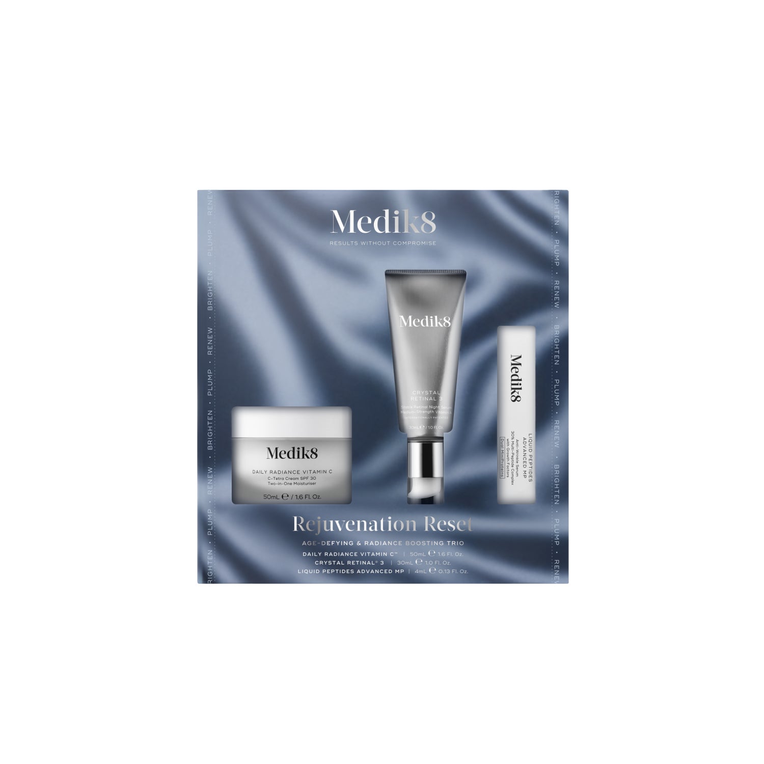 Illumine, protège et renouvelle ta peau avec les ingrédients essentiels CSA et les peptides de Medik8 à l'efficacité prouvée.