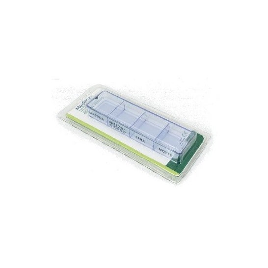 Pilulier journalier en méthacrylate, qui favorise le stockage des médicaments. Il dispose de 4 compartiments avec couvercles ouvrants, un pour chaque prise, dans lesquels disposer des médicaments, facilitant leur répartition au cours de la journée. Elle permet de mémoriser et de conserver le traitement médical. Sa taille compacte le rend idéal pour le transport.