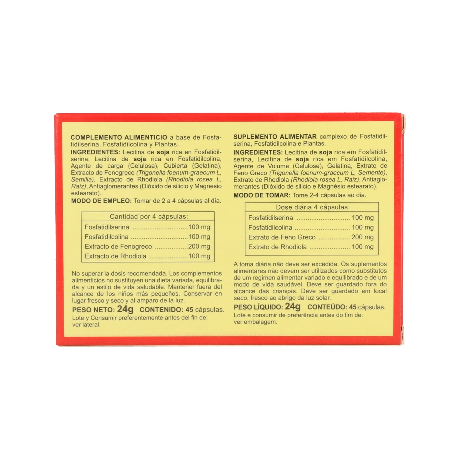 Un complément alimentaire sous forme de gélules, composé d'ingrédients bénéfiques pour les moments où un haut niveau de concentration est nécessaire. Son principal ingrédient est la phosphatidylsérine, un phospholipide qui fait partie de la double couche lipidique du neurone, ce qui contribue à stabiliser le neurone, à le protéger et à améliorer ses fonctions de synthèse des neurotransmetteurs. Il contient de la rhodiola et du fenugrec, des plantes qui contribuent à fournir de l'énergie et à favoriser la concentration.