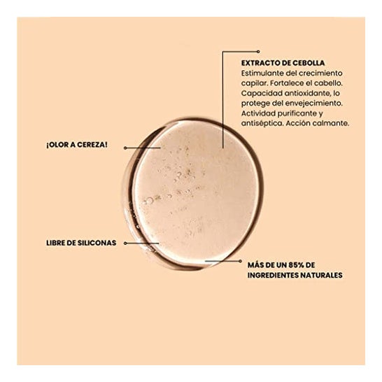 Formulé à base d'extrait d'oignon, de bétaïne et d'amide de noix de coco, ce shampooing nettoie et stimule la croissance des cheveux. Il contient également du Polyquaternium-10, un conditionneur qui favorise l'hydratation des cheveux. Sa texture crémeuse et son arôme agréable de cerise nettoient les cheveux sans faire glisser le film protecteur du cuir chevelu.