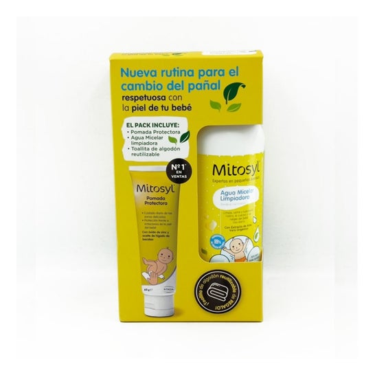 Mitosyl Pack Pommade Protectrice 65 g + Eau Micellaire 500 ml pour le soin de la peau du bébé réunit une pommade protectrice et une eau micellaire pour une hygiène douce et une protection efficace dans la zone de la couche. Il est conçu pour les peaux sensibles des nouveau-nés. Il offre un nettoyage délicat sans rinçage et aide à prévenir les rougeurs, irritations et érythèmes dès le premier jour.