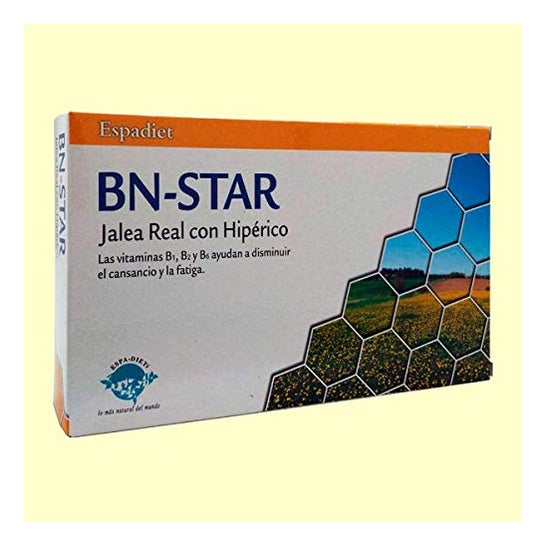 Complément alimentaire formulé pour soutenir le système immunitaire. Produit développé par Espadiet pour tenter d'améliorer les défenses de l'organisme. Aucun produit chimique ou artificiel n'a été utilisé dans la préparation de la gelée Bn-Star, comme dans le reste des produits du fabricant. La composition contient : Gelée royale, Taurine, L-Tyrosine, L-Carnitine, concentré d'Hypericum, Vitamine C, Vitamine B1, Vitamine B2, Vitamine B6, arôme d'orange, eau et fructose.