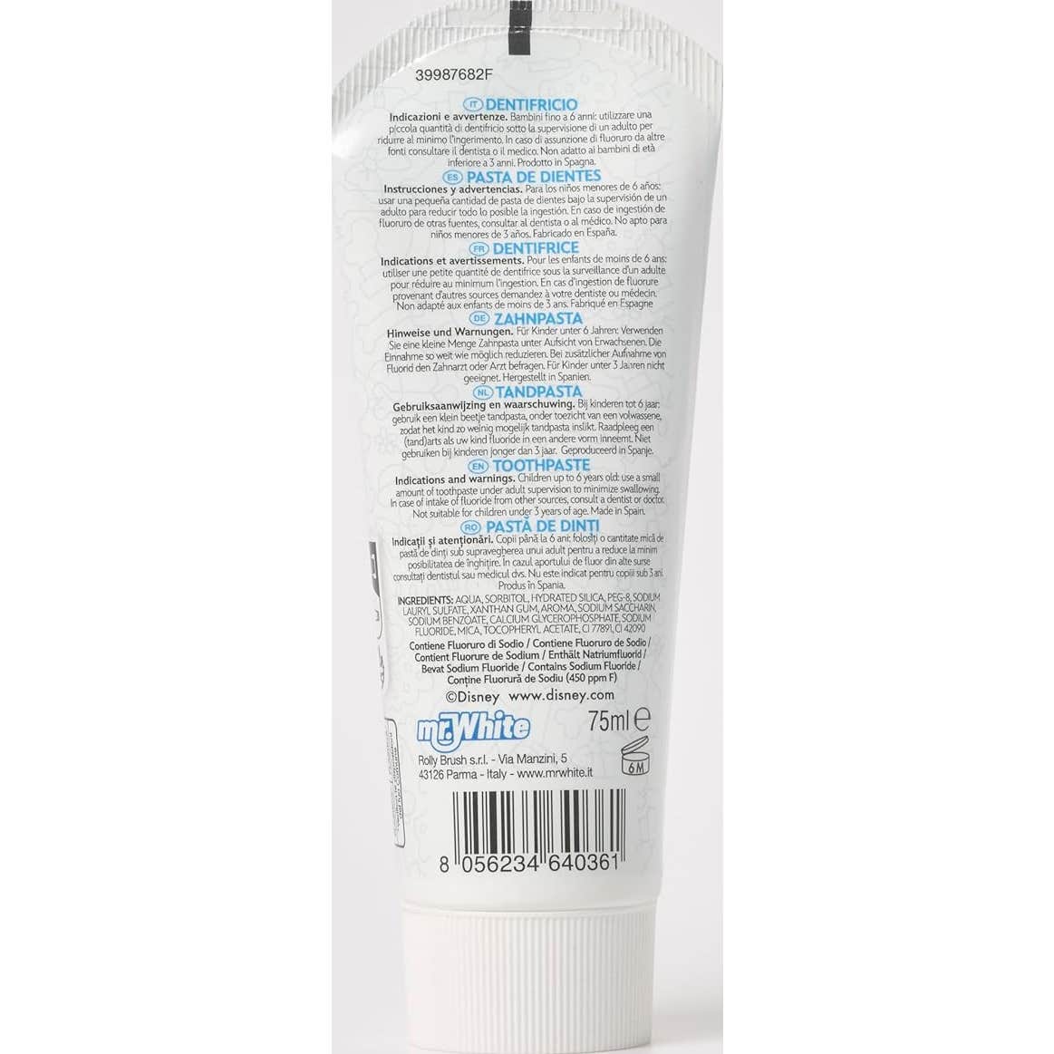 Ce dentifrice présente un design coloré sur le thème de Mickey et ses amis, ce qui ajoute une touche amusante au moment du brossage.