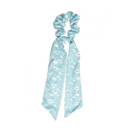 Cravate à cheveux de couleur bleu clair avec un motif de nœud et un imprimé de nuages. Il est conçu pour tous les âges, il aide à créer un look de coiffure. Il convient également pour maintenir les cheveux pour les soins cosmétiques du visage. Fabriqué dans un matériau durable qui n'irrite pas et ne gêne pas le cuir chevelu. Facile à désinfecter.