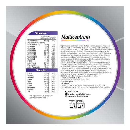 Phosphate dicalcique, Carbonate de calcium, Oxyde de magnésium, Vitamine C, Agents de charge (E460, E468), Maltodextrine, Amidon modifié, Vitamine E, Nicotinamide, Fumarate ferreux, agents de charge (E464, E1200), dpantothénate de calcium, oxyde de zinc, sulfate de manganèse, émulsifiant (E470B), anti-agglomérants (E551, E553B), amidon, Vitamine B2, gélatine, vitamine B6, vitamine B1, huile de palme, bêta-carotène, sulfate de cuivre, saccharose, vitamine A, sirop de glucose, acide folique, chlorure de chrome (III), molybdate de sodium, iodure de potassium, sélénate de sodium, biotine, vitamine K, antioxydant (E321), vitamine D, vitamine B12, colorants (E171, E120, E132).