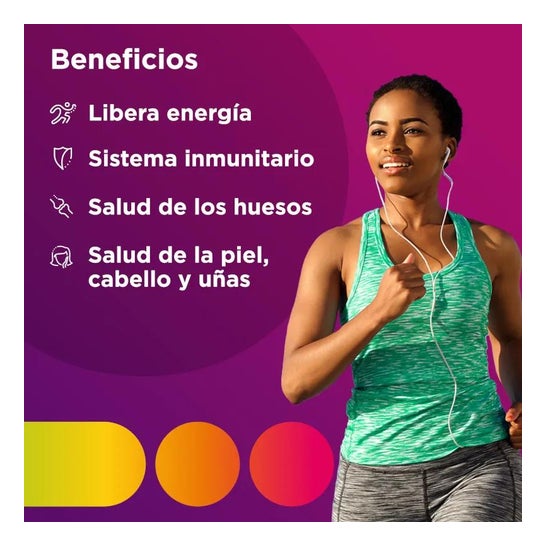 Sa formule contient de la thiamine, de la riboflavine (vitamine B2), des vitamines B6 et B12, de la niacine, de la biotine, de l'acide pantothénique et du fer, qui favorisent un métabolisme énergétique normal. La vitamine C, le sélénium et le zinc contribuent au fonctionnement normal du système immunitaire. La biotine et le zinc aident à maintenir une peau, des cheveux et des ongles en bonne santé. Enfin, le calcium favorise la santé des os et la vitamine D aide à maintenir un taux de calcium sanguin normal.
