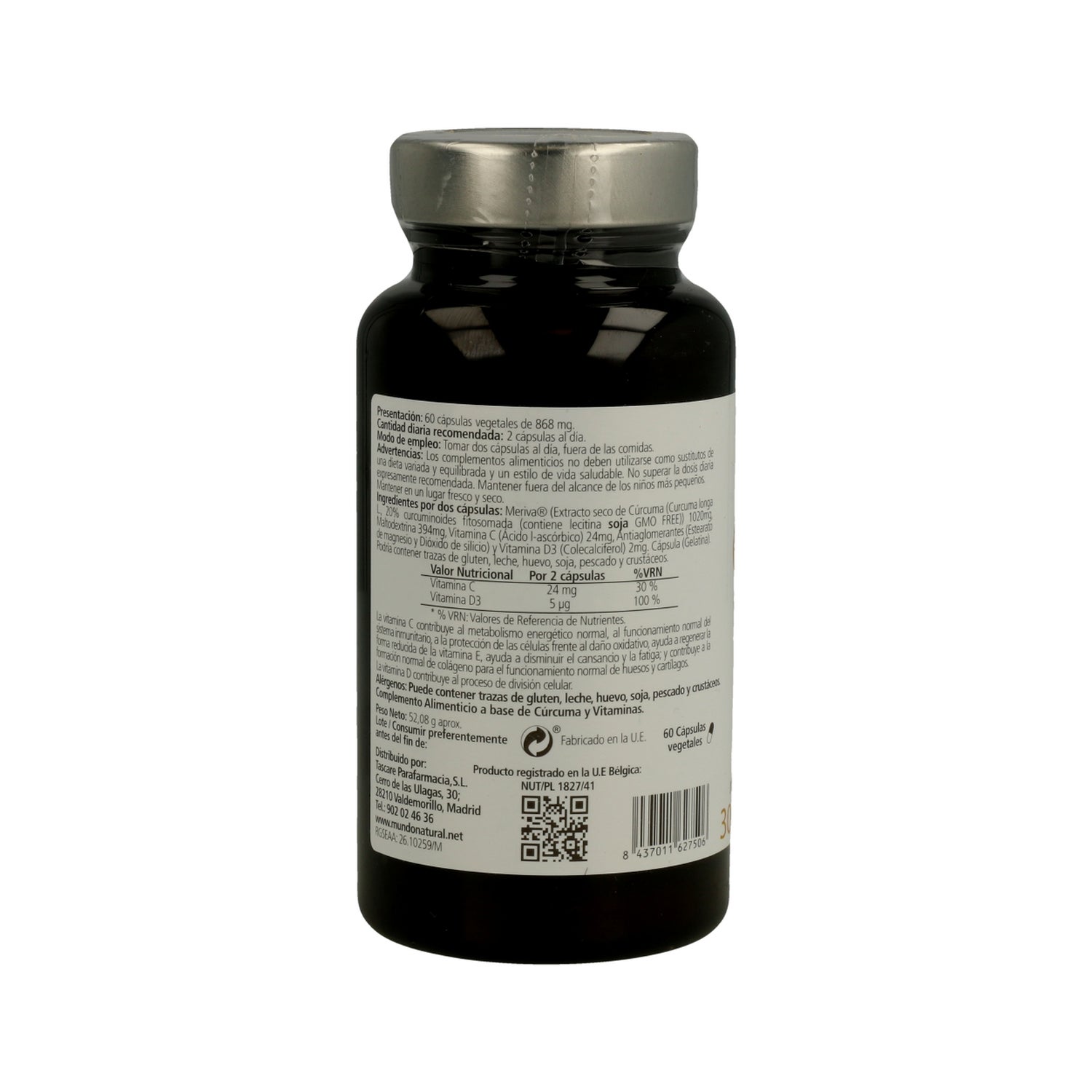 Complément alimentaire élaboré à base de curcuma, vitamine C et vitamine D. Sa formule favorise l'absorption au niveau du système digestif et une plus grande biodisponibilité au niveau des tissus. Son contenu en vitamine C contribue au métabolisme énergétique normal, au fonctionnement normal du système immunitaire, à la protection des cellules contre les dommages oxydatifs, aide à régénérer la forme réduite de la vitamine E, aide à diminuer la fatigue et l'épuisement. Il aide également à la formation normale du collagène pour le fonctionnement normal des os et du cartilage, et la vitamine bénéficie au processus de division cellulaire.