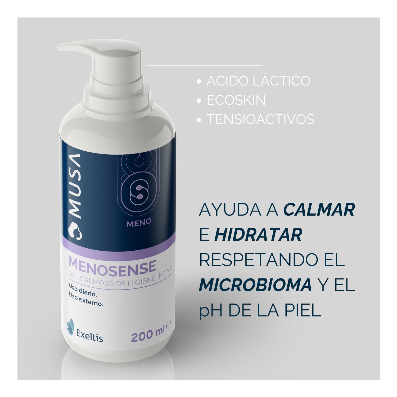 Musa Menosense est un gel crémeux d'hygiène intime qui apaise et hydrate en respectant le microbiome et aide à maintenir le pH physiologique de la zone pour les femmes en période de ménopause.