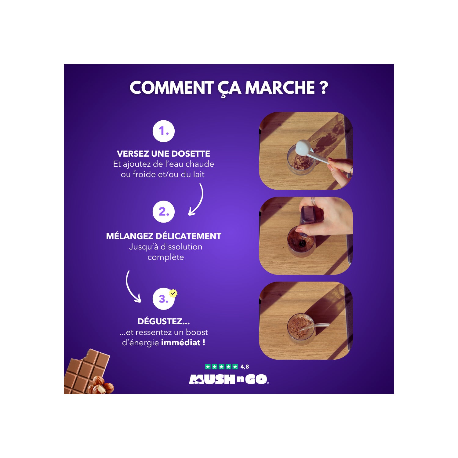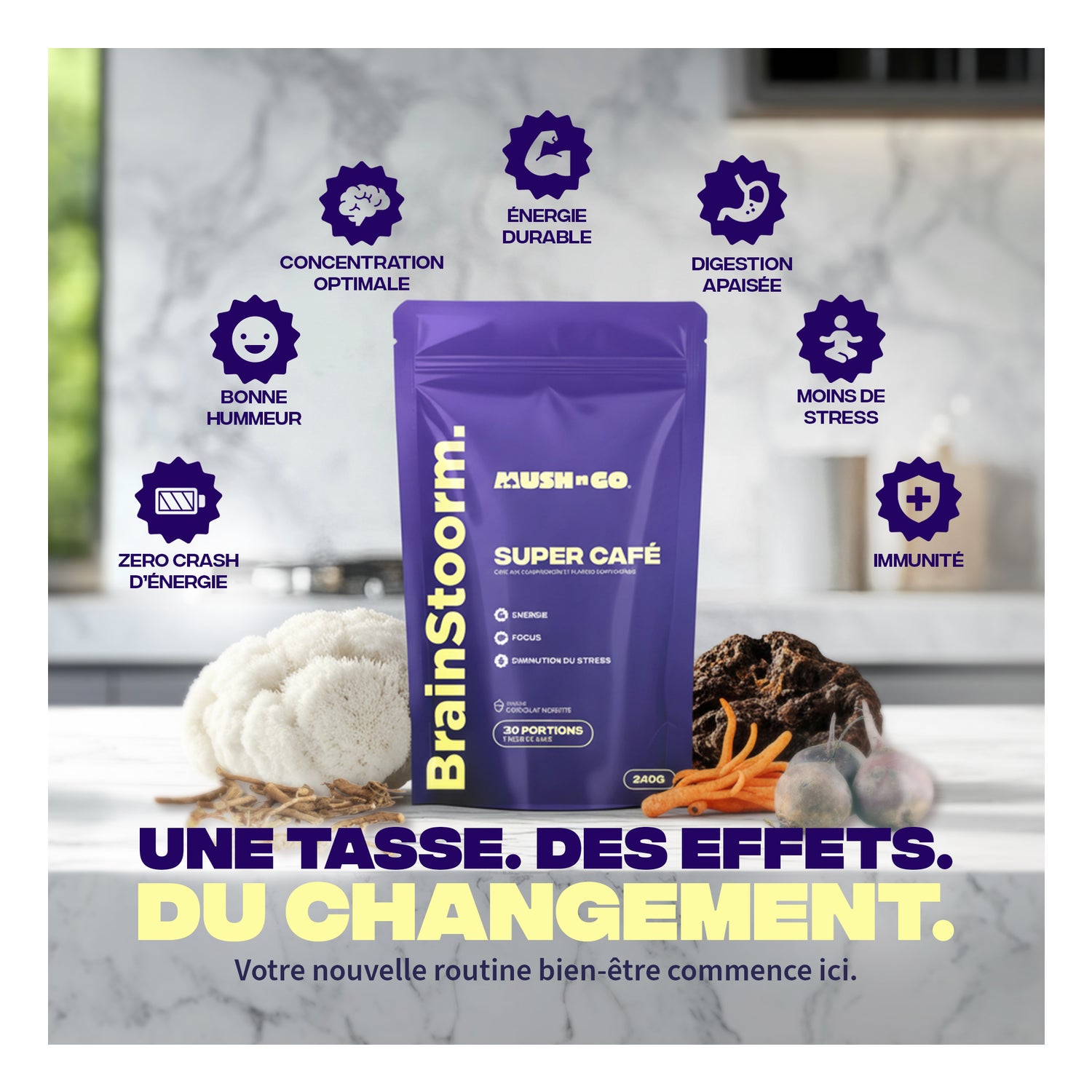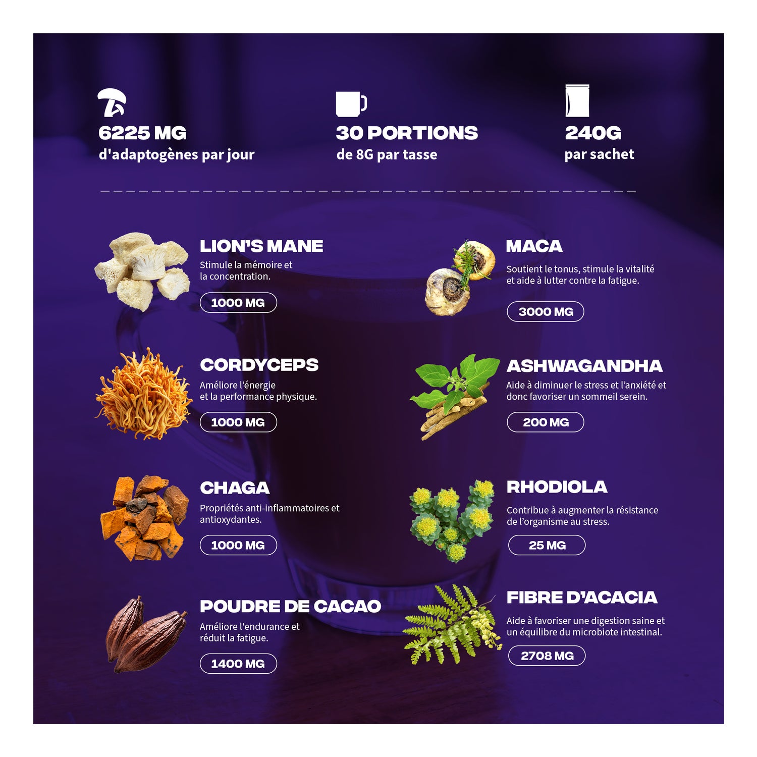 Cette poudre, substitut de café, aide à améliorer la concentration, l'énergie et la gestion du stress sans les effets négatifs du café comme les crashs d'énergie, l'anxiété ou les palpitations.