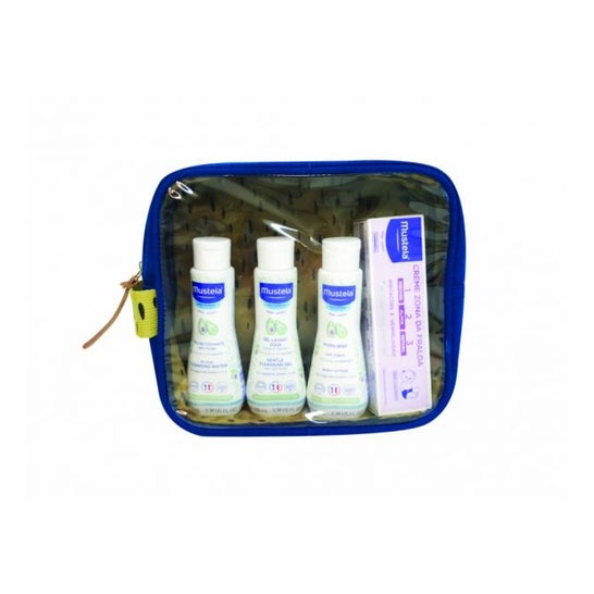 Kit de produits pour l'hygiène des nouveau-nés. Ils sont fabriqués avec 97% de leurs ingrédients d'origine naturelle, et sont présentés dans un sac cosmétique bleu pratique pour le rangement et le transport des produits.