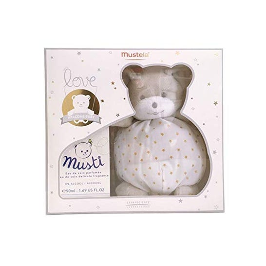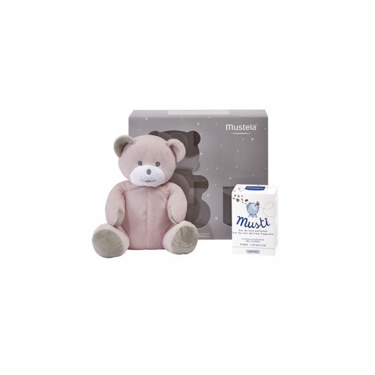 Mustela Coffret Musti Eau de Soin 50ml + Teddy Bear est un coffret Mustela contenant un ours en peluche tout doux et l'eau de cologne pour bébé Mustela Musti Eau de Soin 50ml, à base d'extraits de bleuet et de tilleul, sans alcool et sans paraben. Ce produit parfume délicatement le bébé et aide à développer ses perceptions sensorielles et olfactives. Fabriqué avec une formule haute tolérance et hypoallergénique et testé sous contrôle dermatologique et pédiatrique pour favoriser la santé du bébé.