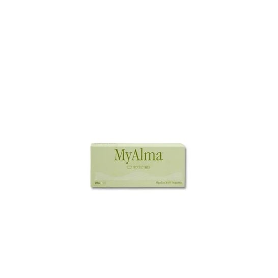 Protège-slip en coton biologique pour les fuites légères de My Alma. La conception et les matériaux respectueux de l'environnement sont respirants et absorbants. En outre, ils protègent naturellement la flore vaginale et sont hypoallergéniques. Produit testé dermatologiquement.