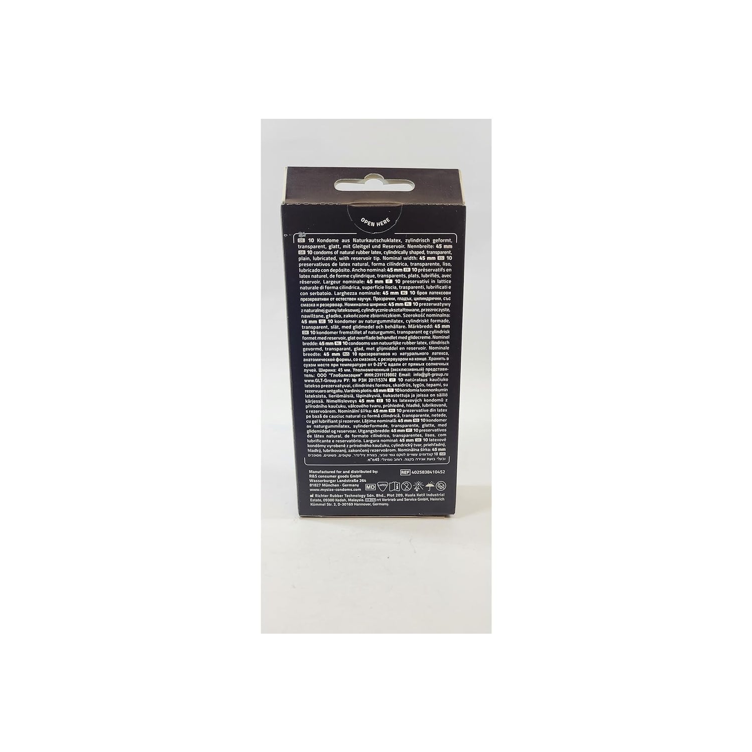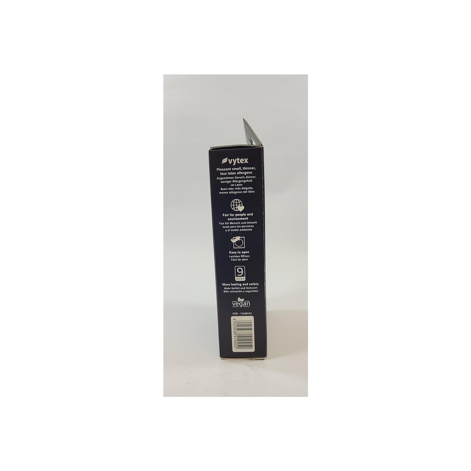 Préservatifs en latex de caoutchouc naturel, lisses, lubrifiés et avec réservoir d'éjaculation. Fabriqués en latex Vytex, avec 90 % de protéines de latex en moins. Ils sont présentés dans une boîte de 10 préservatifs emballés individuellement, transparents, au goût neutre et lubrifiés. Utilisés correctement, ils sont efficaces pour prévenir la grossesse et les maladies sexuellement transmissibles. Ils ont une taille de 0,45 millimètre et conviennent à des pénis de 8 à 9 centimètres. Testés électroniquement. Fabriqués en Allemagne.