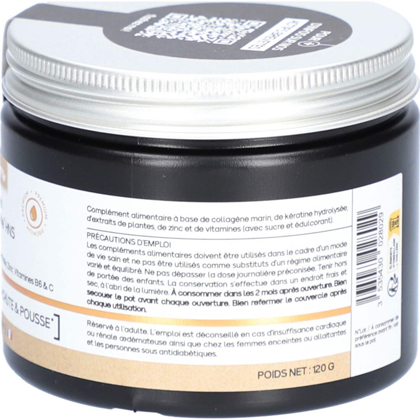 Nat & Form Collagène Marin Kératine Cynatine Hns 2.5G Poudre 120g est un complément conçu pour renforcer les cheveux et aider à prévenir leur chute. Ce produit combine :
