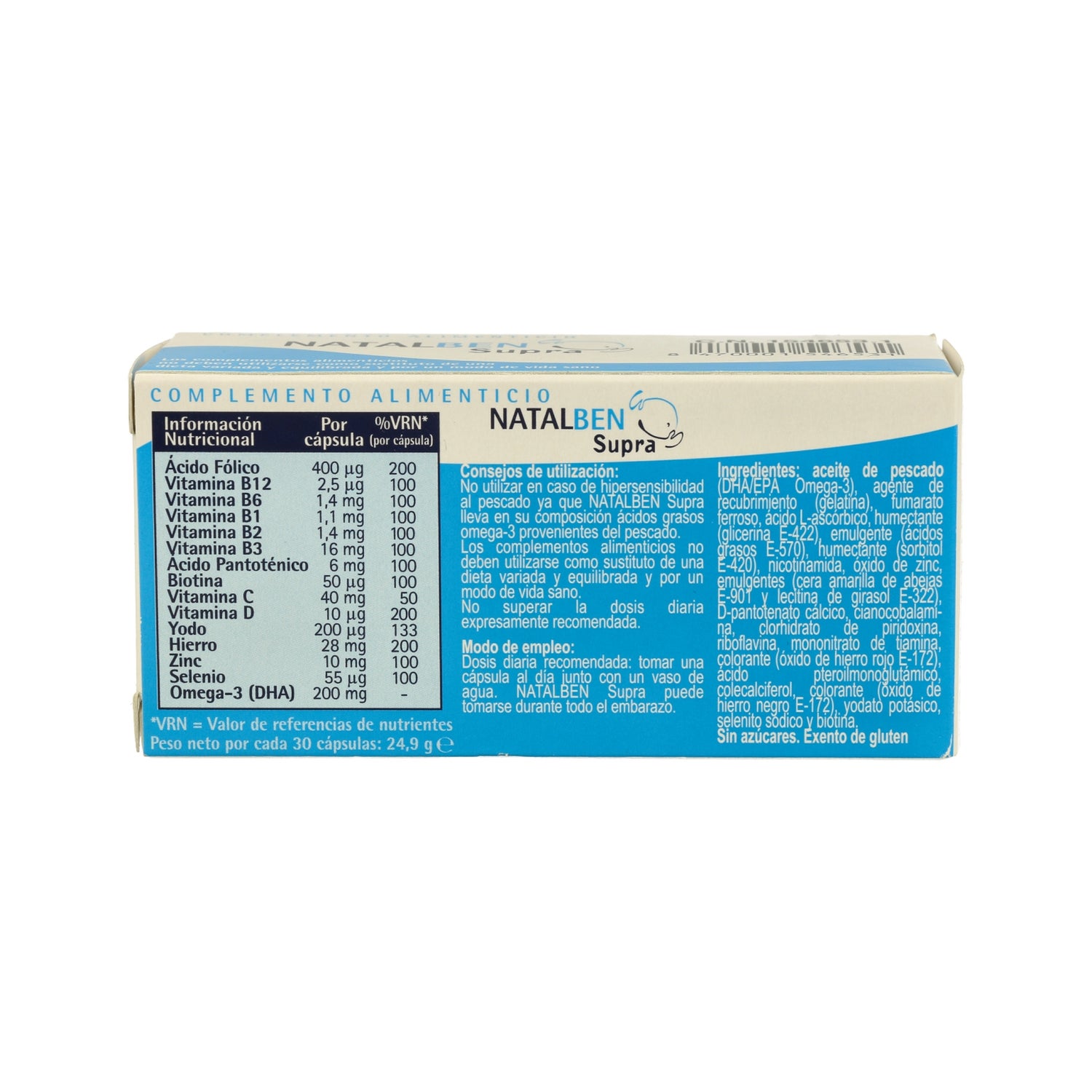 Natalben Supra 30 Gélules est un complément alimentaire qui aide à couvrir les besoins nutritionnels des femmes de la grossesse à l'allaitement.