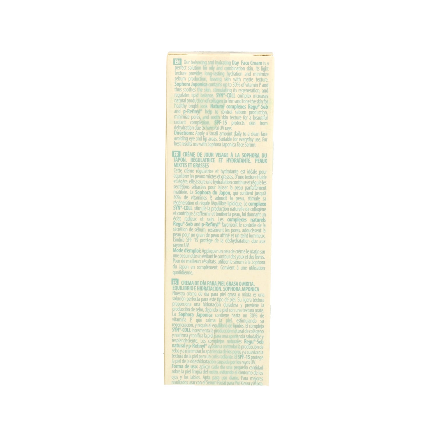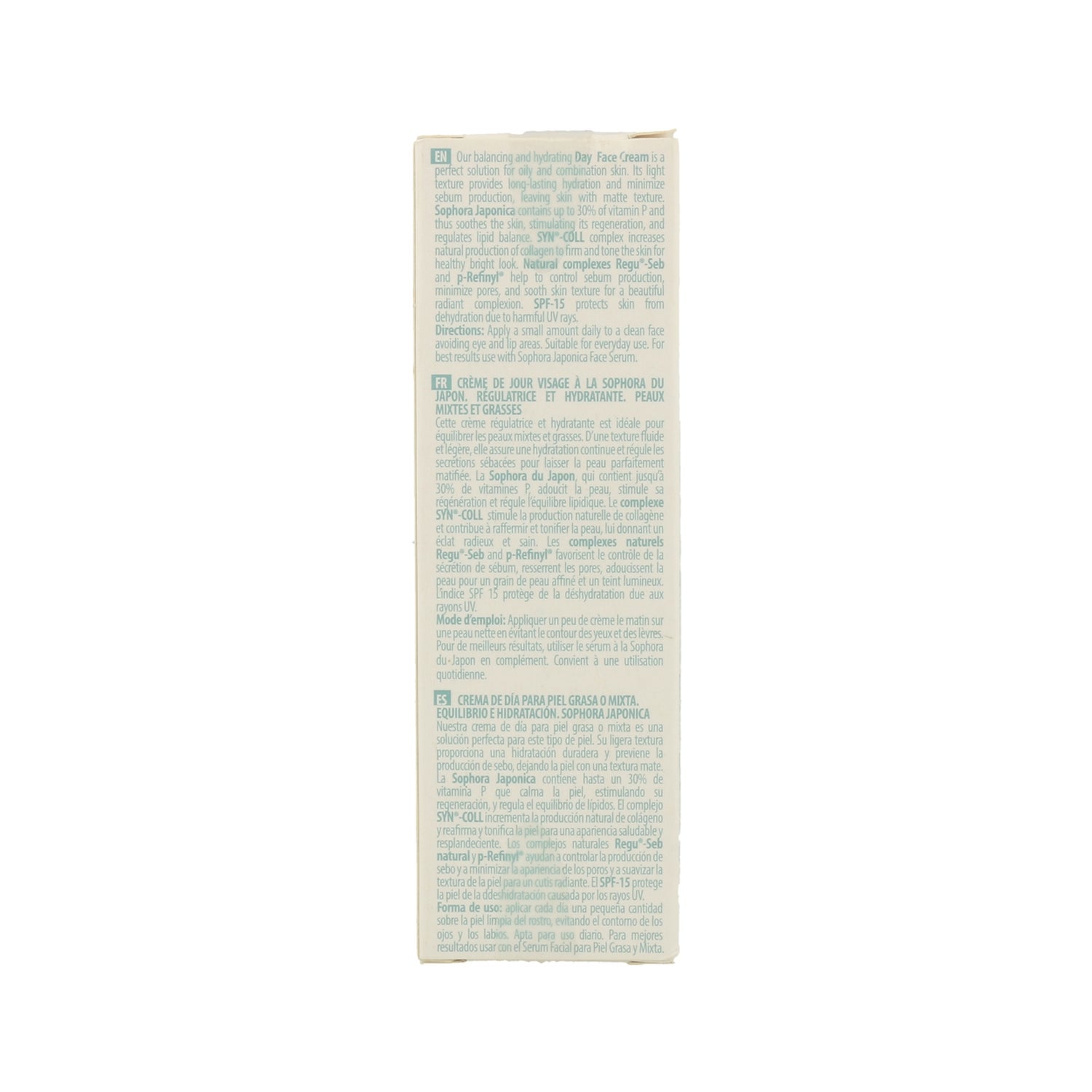 Crème à usage quotidien qui aide à hydrater et à équilibrer la peau. Composé d'extrait de sophora sauvage japonais, de phyto-peptides naturels, qui stimulent la synthèse du collagène, d'acide hyaluronique, de vitamine C et de SPF 15, qui aident à protéger la peau contre les rayons UV nocifs. Le sophora japonais contient jusqu'à 30 % de vitamine P, qui contribue à apaiser la peau, à stimuler sa régénération et à réguler l'équilibre lipidique. Le complexe Syn-Coll augmente la production naturelle de collagène, le Regu-Seb et le p-Refinyl aident à contrôler la production de sébum, à minimiser les pores et à lisser la texture de la peau. Convient particulièrement aux peaux mixtes et grasses. Produit certifié vegan et biologique. Avec des ingrédients issus de l'agriculture biologique et de la cueillette sauvage