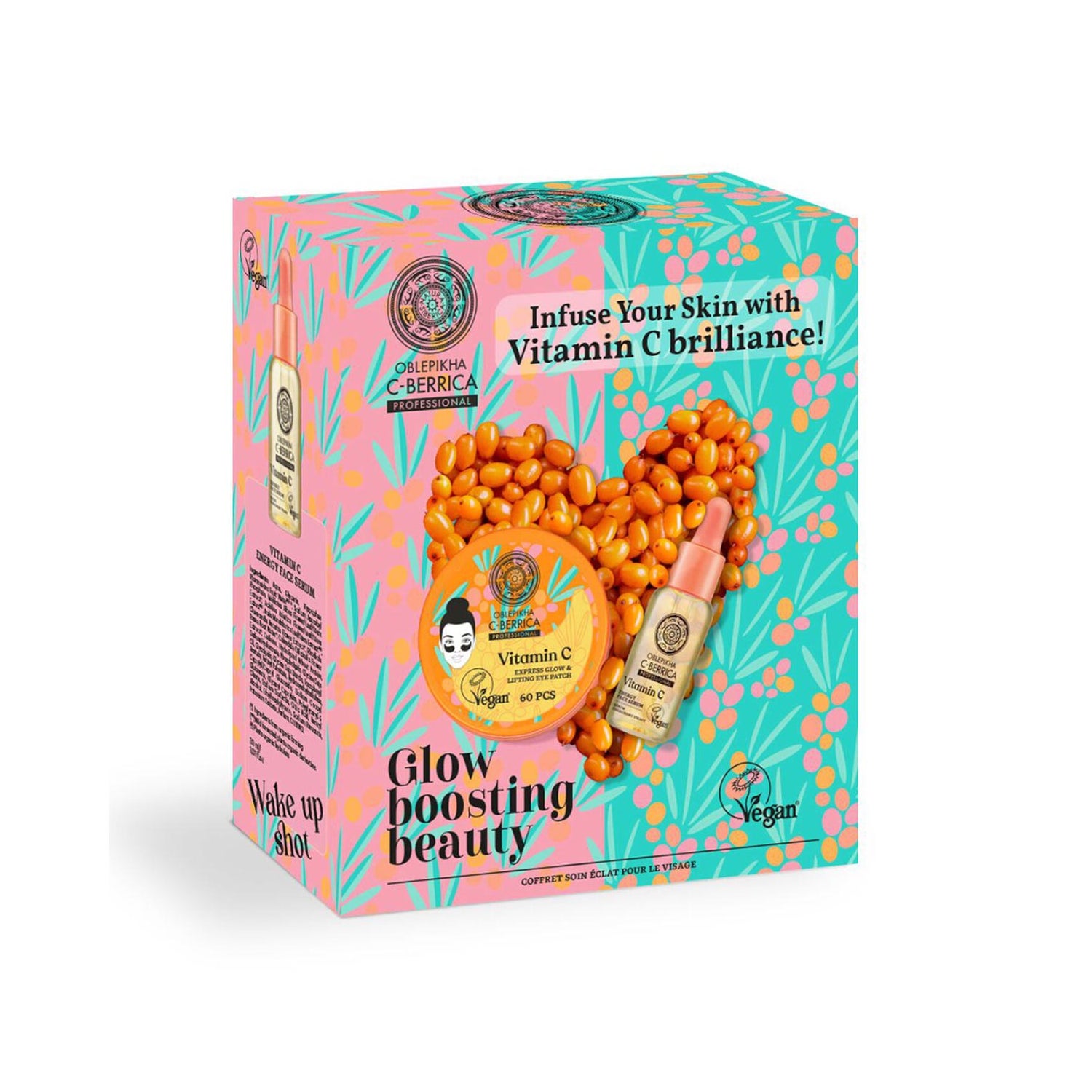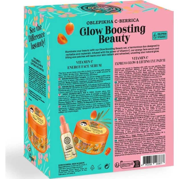 Natura Siberica Oblepikha C-Berrica Glow Boosting Beauty Set est un ensemble conçu pour rehausser la luminosité de la peau. Ce set comprend un sérum facial énergisant et des patchs raffermissants pour le contour des yeux, qui travaillent en synergie pour revitaliser et donner un aspect radieux.
